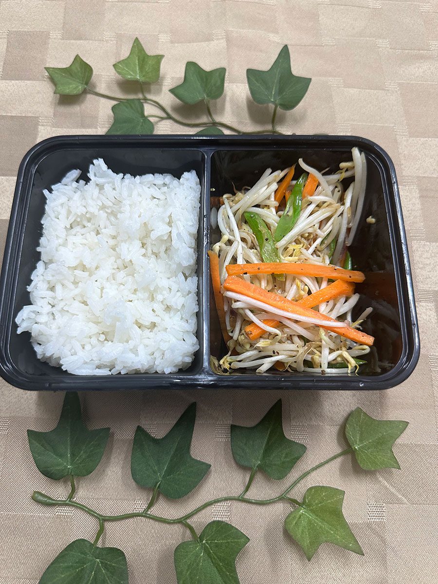 A mix of bean sprouts, carrot, onion, green beans, cabbage, and garlic lightly seasoned, sauteed in low heat